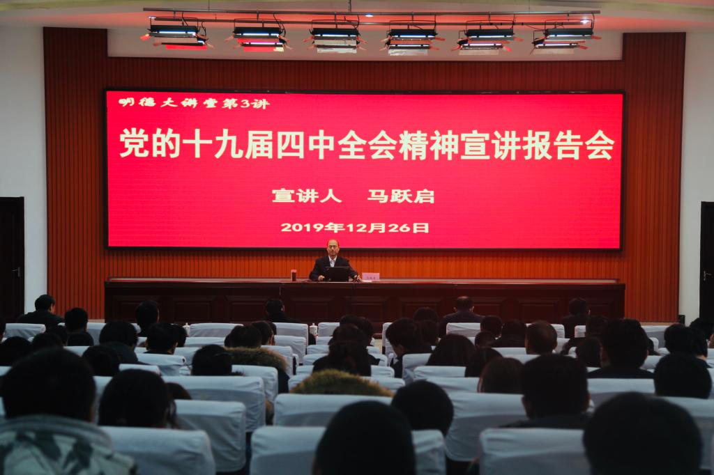 为深入学习宣传贯彻党的十九届四中全会精神,进一步用全会精神统一思想、凝聚共识,根据市委统一部署,12月26日上午,学院党的十九届四中全会精神宣讲报告会在清泽楼报告厅举行,党委书记马跃启同志作宣讲报告。学院领导宋桂言、赵君堂、李瑞昌、郭晓辉、刘德强,学院中层干部和教师代表、学生代表参加报告会。 马跃启以“新时代中国之治的行动纲领”为题,围绕“会议召开的时代背景”“坚定中国特色社会主义制度自信”“中国特色社会主义制度的显著优势”“新时代中国之治的战略部署”四个方面的问题,深入阐释了党的十九届四中全会的重大意义和中国特色社会主义制度与国家治理体系的显著优势,对全会《决定》提出的总体要求、总体目标和重点任务进行了系统解读,对认真学习宣传贯彻党的十九届四中全会精神谈了认识体会。 马跃启指出,要把学习宣传贯彻习近平总书记重要讲话和党的十九届四中全会精神作为一项重大的政治任务,切实增强“四个意识”、坚定“四个自信”、做到“两个维护”,坚持制度优势,优化治理体系,完善制度集成,提高治理效能,把党的十九届四中全会确定的各项目标任务落实到位。他还结合自己的亲身经历,以个人的视角阐述“我们党领导人民创造了世所罕见的经济快速发展奇迹和社会长期稳定奇迹,中华民族迎来了从站起来、富起来到强起来的伟大飞跃”,大大激发了参会师生的爱国热情。 宣讲报告聚焦重点和关键,内涵丰富、系统全面,深入浅出、鲜活生动、论述精辟,令参加宣讲报告会的师生深受启迪,倍受教育。大家纷纷表示,要把学习贯彻四中全会精神与“不忘初心、牢记使命”主题教育结合起来,同履行自己教学、学习职责义务结合起来,确保全会精神落到实处、见到实效。(王立志供稿)