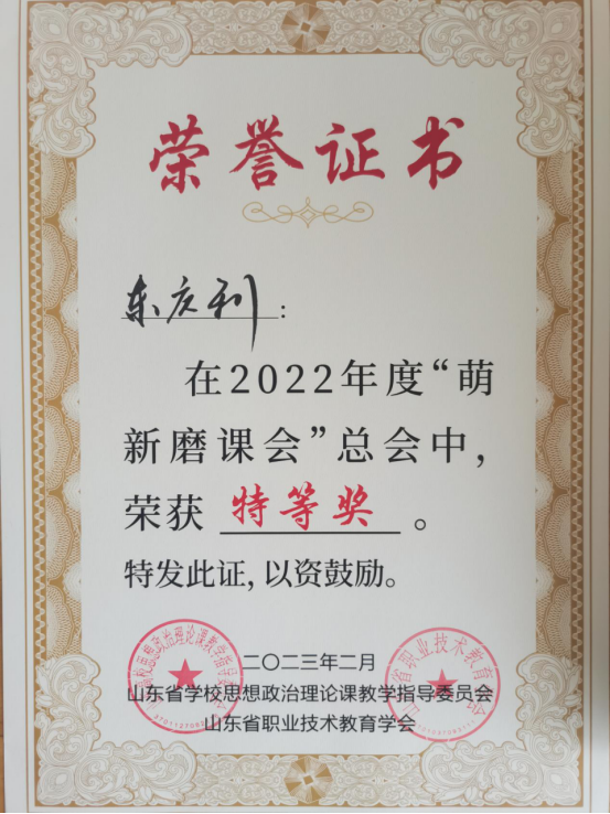 近日,山东高校思政课2022年度“萌新磨课总会”教学展示在泰安举办。全省高校共评出本科高校组特等奖4项、一等奖5项、二等奖35项,高职高专组特等奖4项、一等奖6项、二等奖30项。省教育厅总督学仲红波,省教育厅思政处处长陈成标出席活动。我院永利集团88304思政课教师东庆利荣获2022年度“萌新磨课总会”教学展示高职高专组特等奖。
