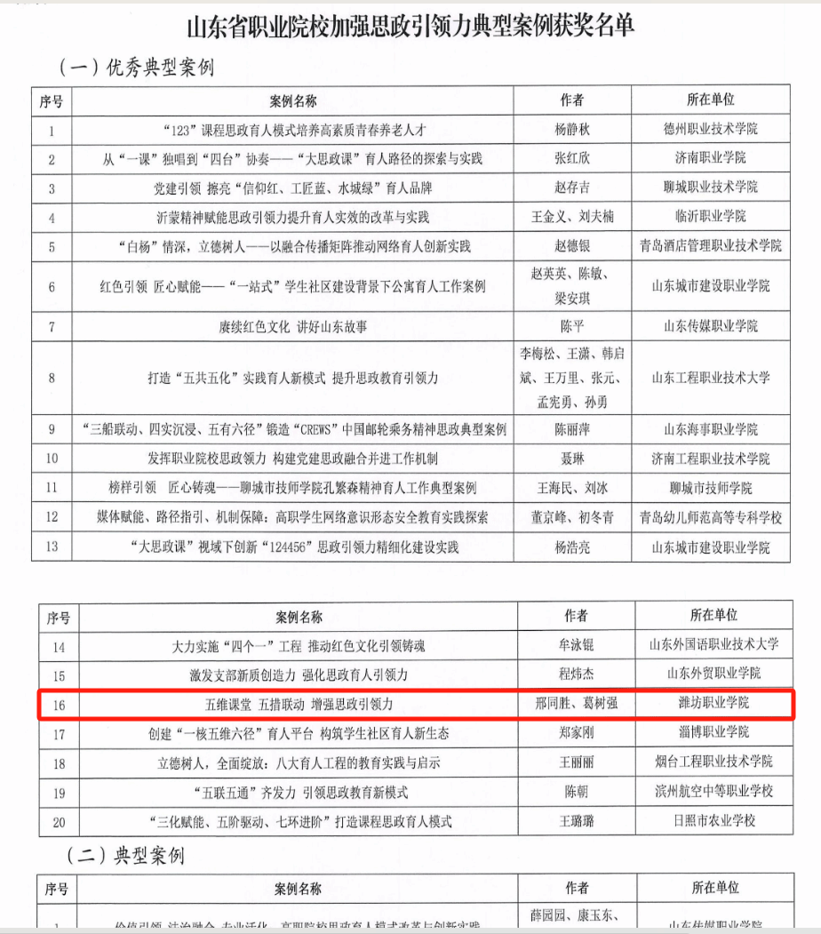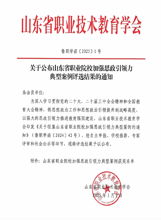 为学习贯彻党的二十大、党的二十届三中全会精神和全国教育大会精神,将思想政治工作和思想政治引领提升到战略高度,以强大思政引领力推进教育强国建设,山东省职业技术教育学会牵头,党建工作委员会组织,全省职业院校积极参与,经自主申报、学校推荐、专家评审、社会公示等环节,最终评选出优秀典型案例20项、典型案例30项。