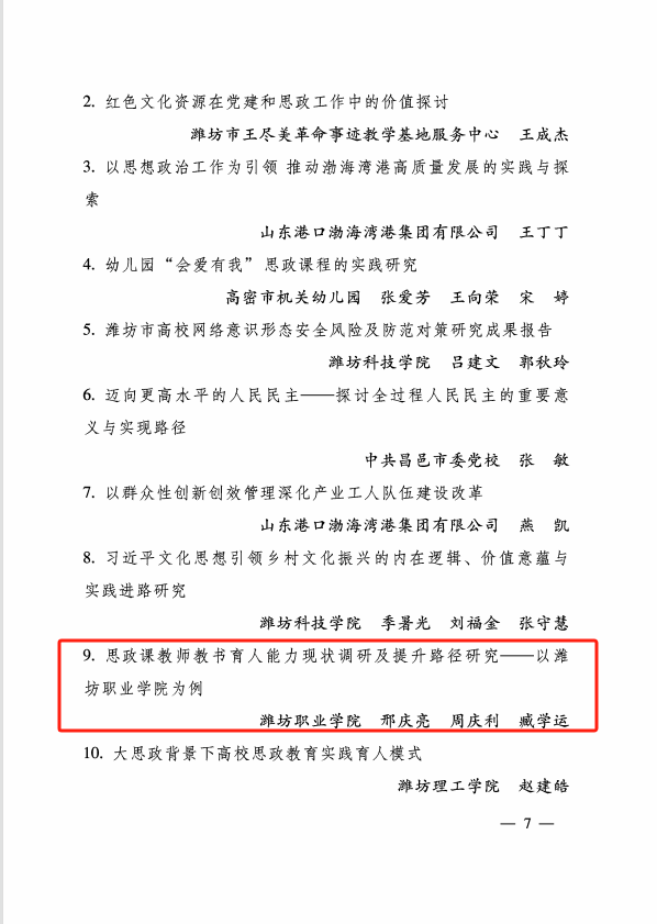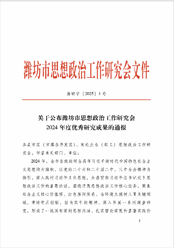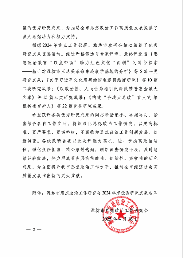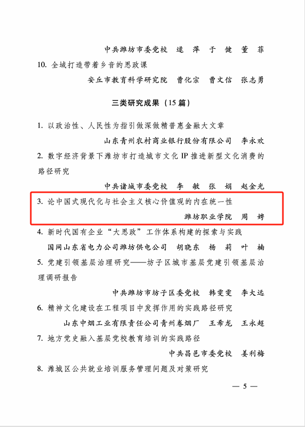 近日,潍坊市思想政治工作研究会公布了2024年度优秀研究成果评选结果,全市共评选出具有深刻思想内涵、扎实理论深度和显著实践价值的研究成果52项,我院永利集团88304申报的2项成果获奖。周娉老师的论文《论中国式现代化与社会主义核心价值观的内在统一性》获三类研究成果,邢庆亮教授主持的调研报告《思政课教师教书育人能力现状调研及提升路径研究 ——以永利集团为例》获优秀研究成果。