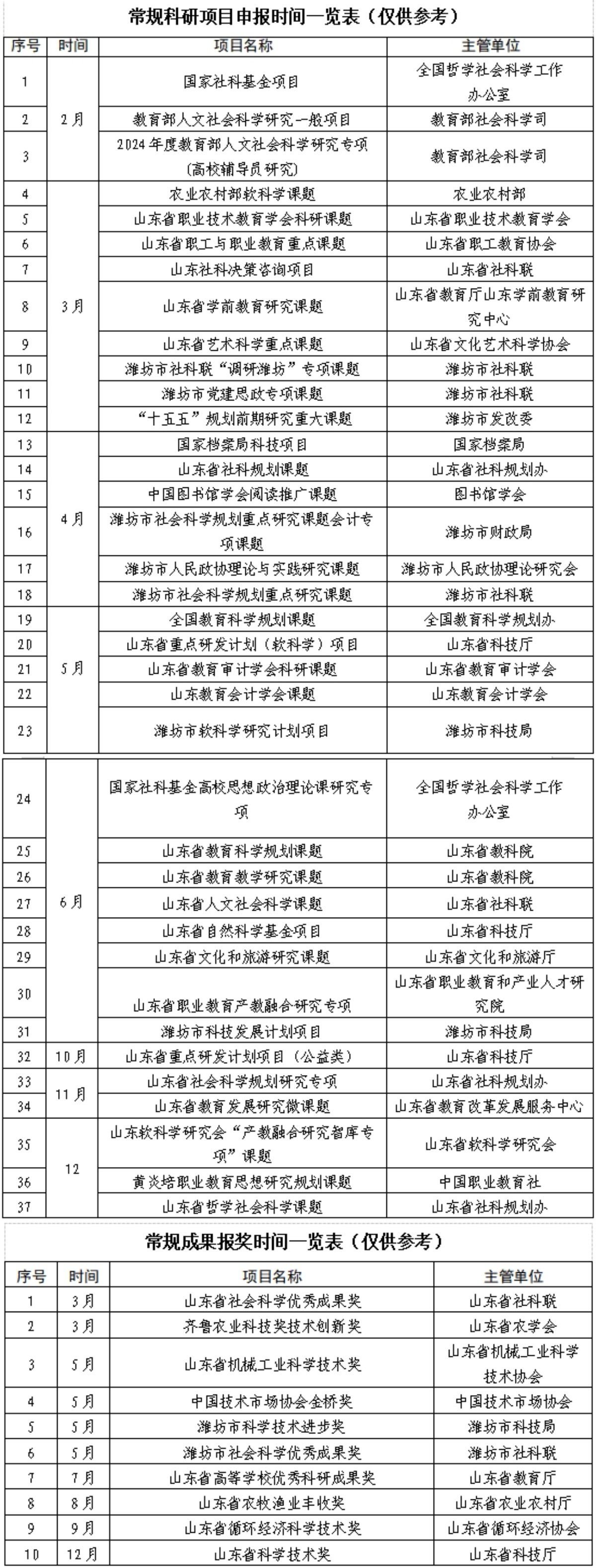 常规科研项目申报和常规成果报奖时间一览表