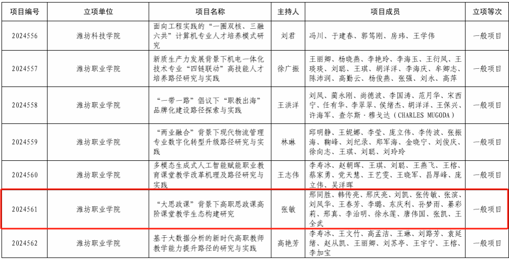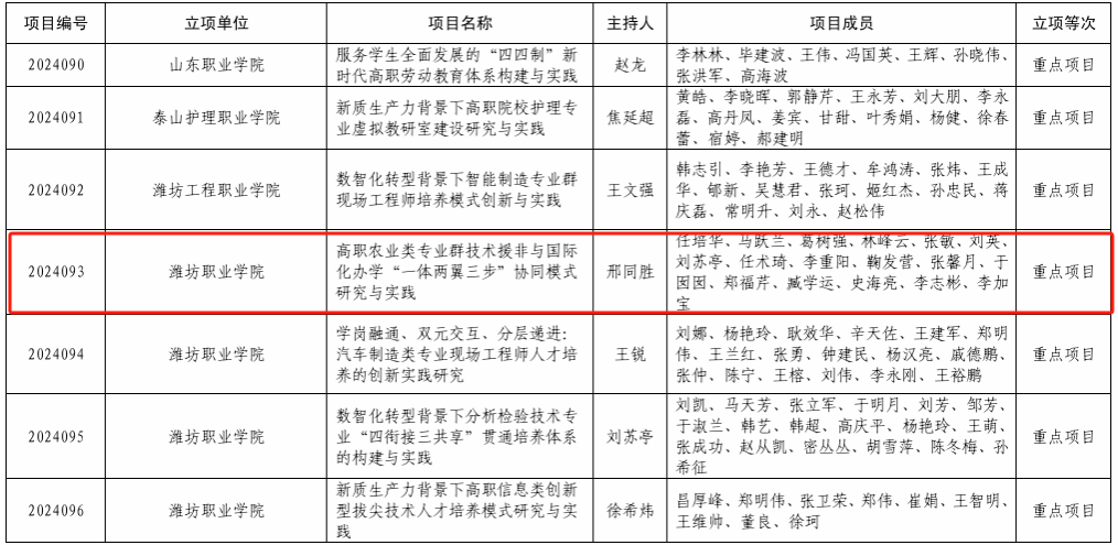 邢同胜老师申报的课题“高职农业类专业群技术援非与国际化办学‘一体两翼三步’协同模式研究与实践”,凭借其独特的视角和创新的思路,成功被列为2024年度山东省职业教育教学改革研究重点项目。张敏老师申报的课题“‘大思政课’背景下高职思政课高阶课堂教学生态构建研究”,也被列为2024年度山东省职业教育教学改革研究一般项目。葛树强老师申报的课题“中国式现代化视域下高职‘大思政课’立体化育人体系向度转化与实践路径研究”,凭借其深入的理论探讨和实践创新,被列为2024年度山东省教育教学研究一般课题。此次课题立项的成功,不仅是对我院教师科研能力和学术水平的肯定,更是对我院教育教学改革和科研创新工作的有力推动。